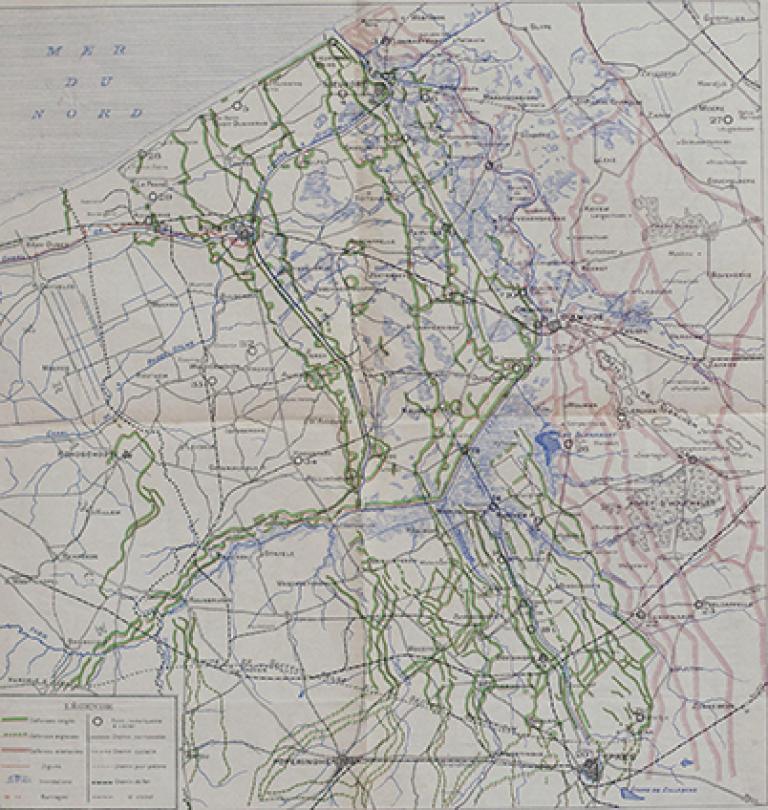 The trenches at the front of the Yser were usually built aboveground because the water level made digging impossible. Sectors were fortified with successive lines of resistance. Behind the main line of resistance there was a second line with the same length. If necessary and when time permitted, other lines of resistance were added.